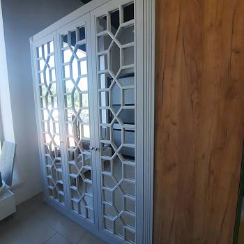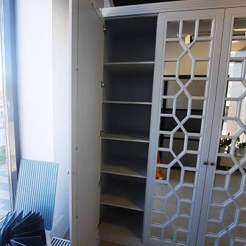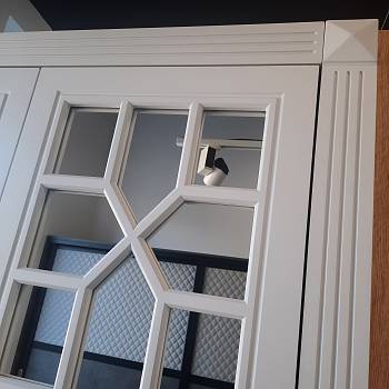 Двери МДФ Белая односторонняя. Покраска по RAL 7047. Зеркальные вставки с ажурной фрезеровкой