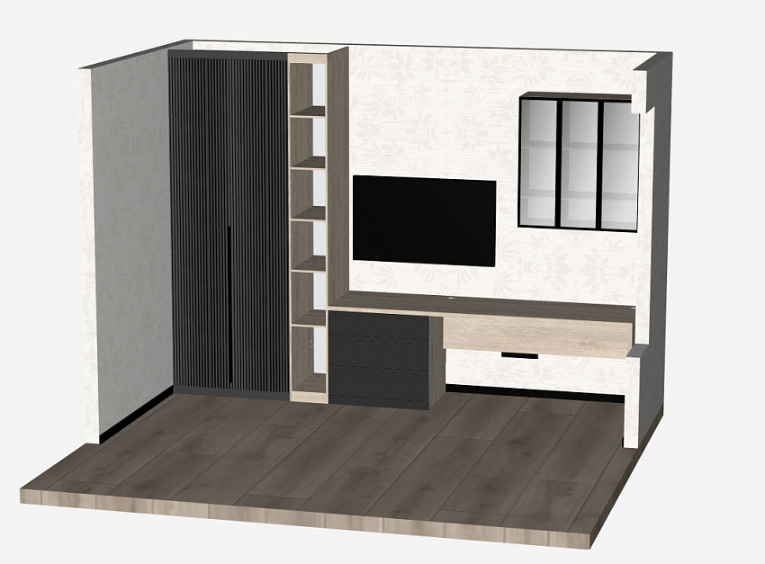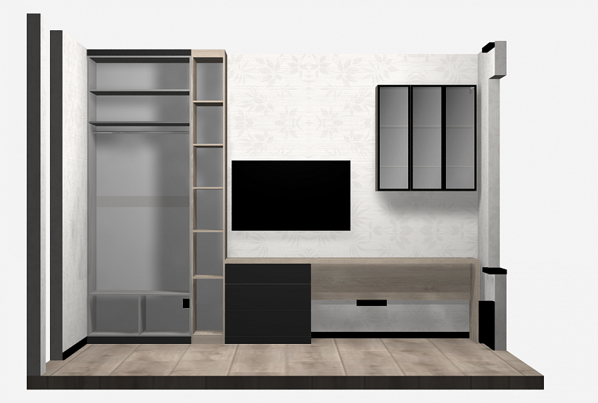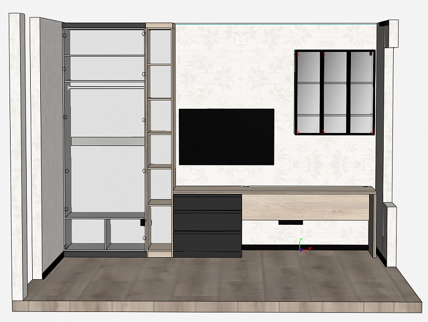 Габариты тумбы ТВ: ширина 3506 мм, высота 2628 мм, глубина 600 мм.