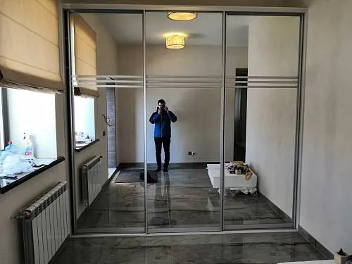 При входе в дом нужно зеркало в полный рост. Все три двери-купе сделали зеркальными также для того, чтобы визуально расширить пространство прихожей. Просто зеркало казалось скучным, но было необходимо. Поэтому решили создать ритм на дверях декоративными профилями-накладками. Внутреннее наполнение сделали нейтральным, светлым, под цвет стен.