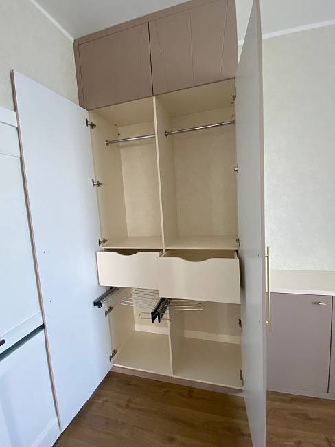 - Фурнитура: петли Samet с доводчиками, направляющие для ящиков SmartSlide Samet полного выдвижения скрытого монтажа с доводчиками, вешалка для галстуков боковая Razzio, вешалка для брюк боковая Razzio.
